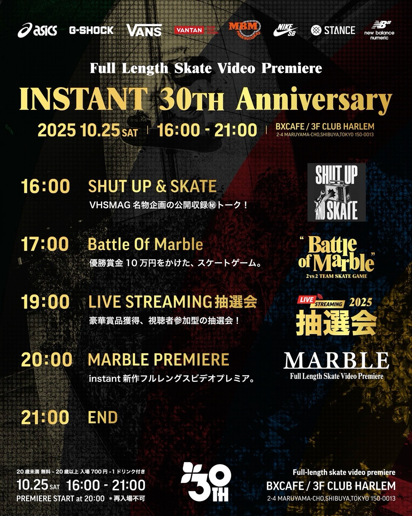 INSTANT 30th AnniversaryTIME TABLEFull Length Skate Video “MARBLE” Premiere16:00 SHUT UP & SKATE 公開生収録17:00 Battle of Marble(YOUTUBE LIVE)19:00 Surprise Time(YOUTUBE LIVE)20:00 MARBLE Premiere21:00 終了開催日:2025年10月25日(土)会場:BXCAFE / CLUB HARLEM 3F(渋谷)入場料:20歳未満 無料 / 20歳以上 700円(1ドリンク付き)※再入場はできません。入場時に顔写真付き身分証明書による年齢確認を行います。 ライブ配信:INSTANT公式YouTubeチャンネル(@instant skateboards) 配信日時:2025年10月25日(土)17:00〜20:00#instantXXX #MARBLE