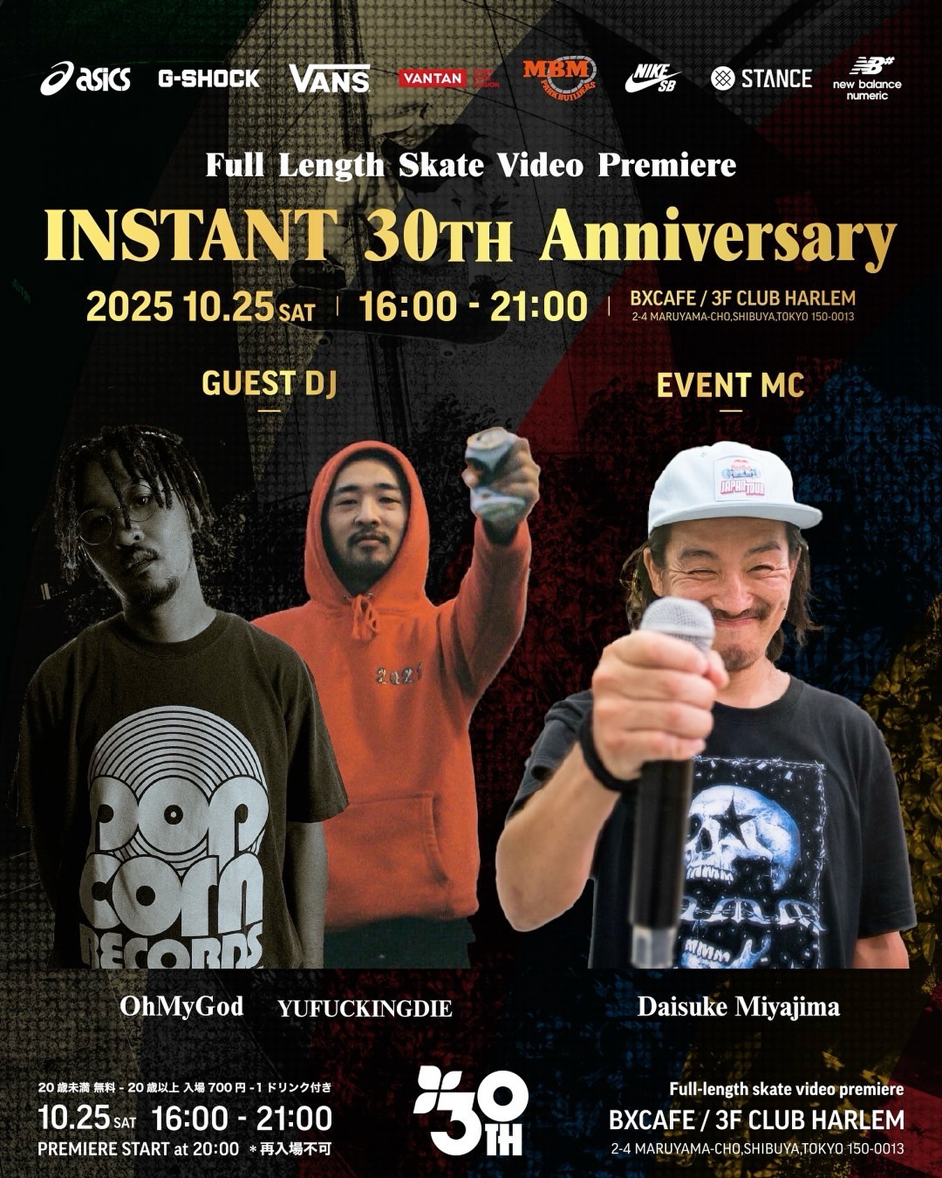 INSTANT 30th Anniversary今回のイベントを支えるのは、最高の夜の空気を作り出す音と言葉のプロフェッショナル。会場全体をひとつにする熱狂のグルーヴを是非体感してください。【DJ】OhMyGodスケートチームG.I.F.T.所属。千葉のヒップホップパーティー「A’+ONE」を主催し、20周年イベントも成功に導いた。スクラッチやジャグリングを自在に操り、どんなジャンルでもヒップホップへ昇華。ジャズ、ソウル、レアグルーヴ、シティポップまで幅広く網羅する膨大なレコードコレクションを武器に、千葉を代表するDJの一人として活動を続ける。YUFUCKINGDIE6歳でスケートボードを始め、スケートビデオを通してロックに魅了される。吉祥寺のBAR CHEEKYでDJをスタートし、現在はスケーターDJの象徴的存在として活動中。【MC】JIMAMC、FILMER、DJ、そしてMXMXMのディレクターなど多方面で活躍。スケーターから一般観客までを巻き込むマイクスキルで会場を沸かせる日本スケートシーンのキーパーソン。日時:2025年10月25日(土)16:00〜21:00会場:BXCAFE / CLUB HARLEM 3F(渋谷)入場料:20歳未満 無料 / 20歳以上 700円(1ドリンク付き)※再入場はできません。入場時に顔写真付き身分証明書による年齢確認を行います。#instantXXX #MARBLE