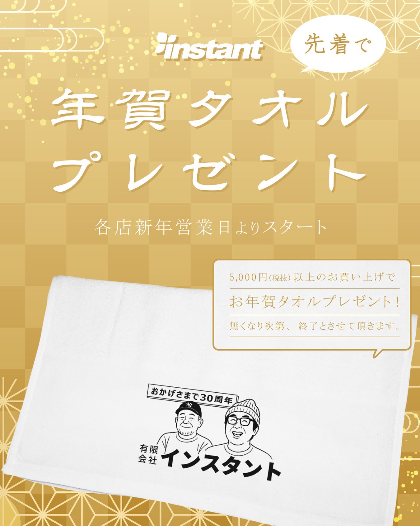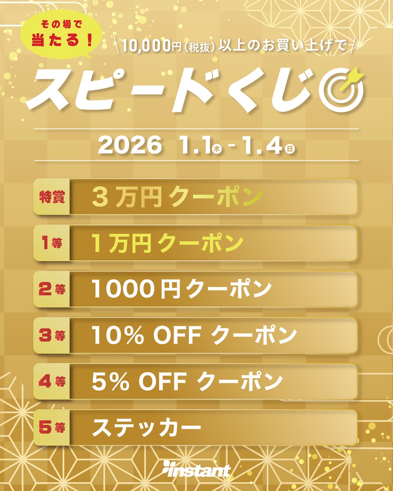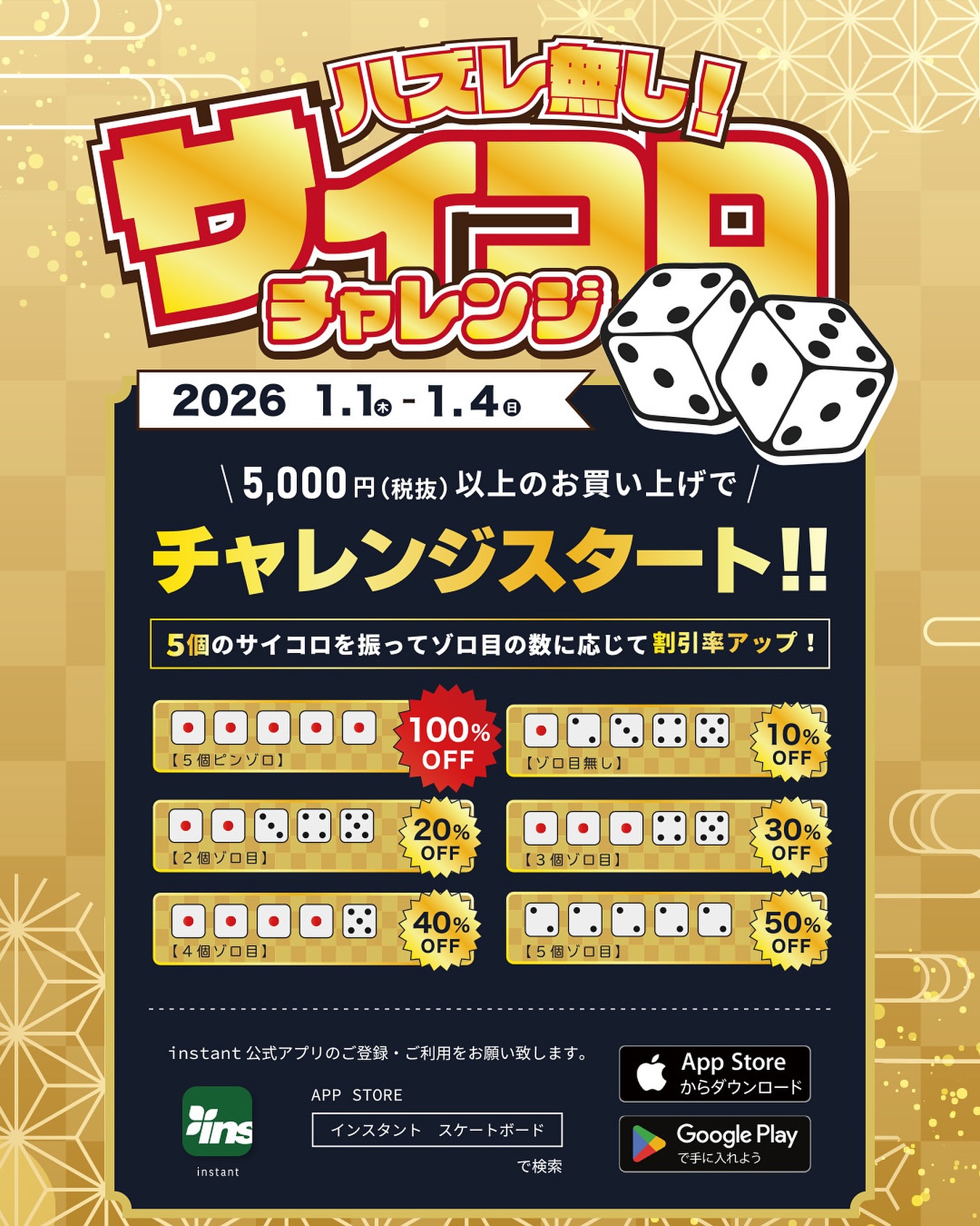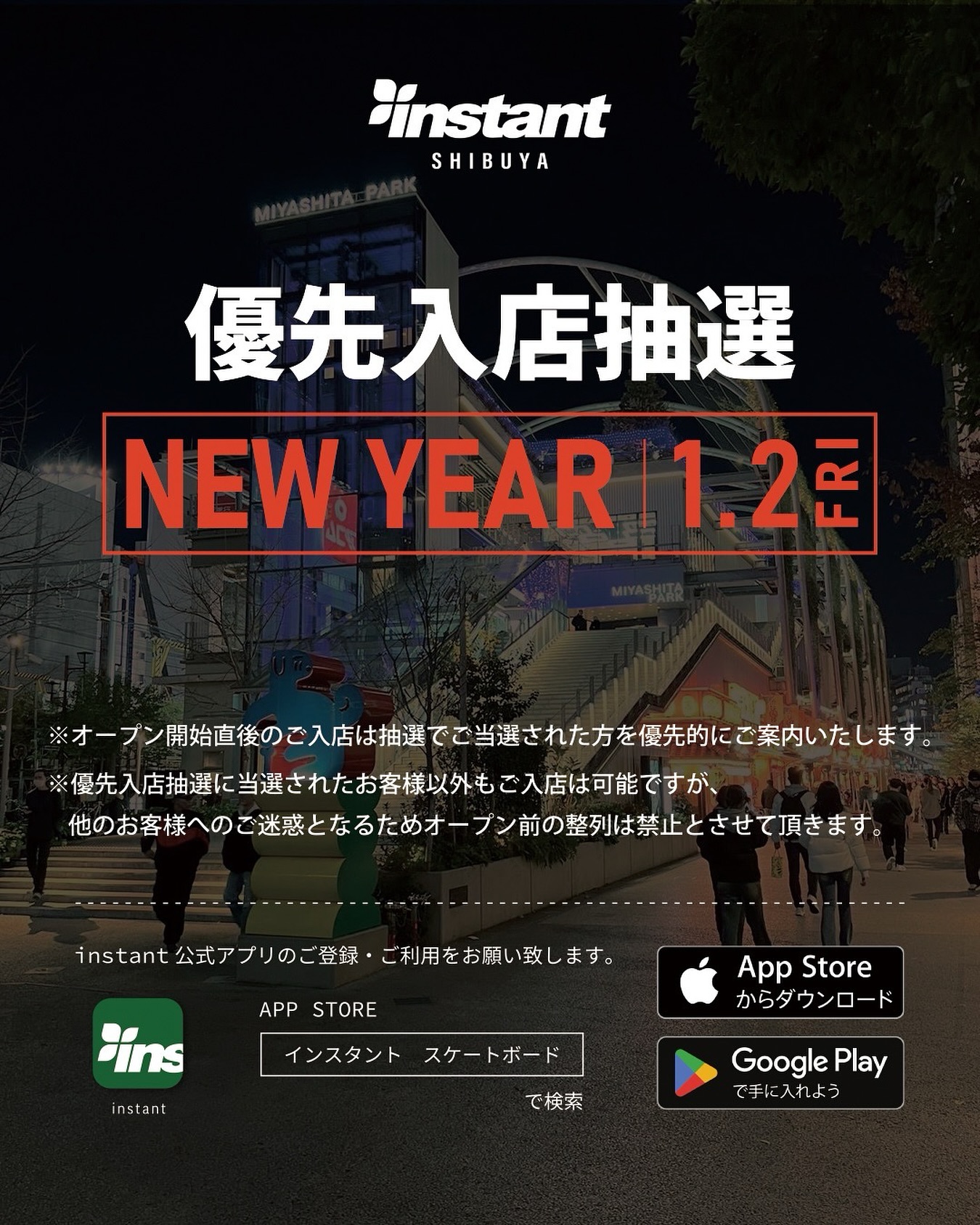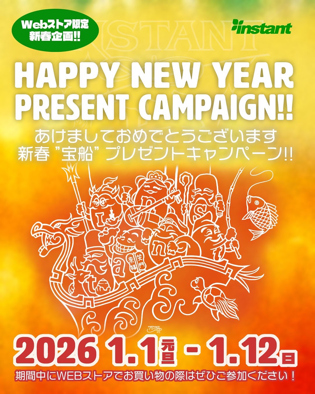 WEBストア新春企画『新春"宝船"プレゼントキャンペーン』WEBストア限定企画開催!2026/1/1〜1/12の期間中、WEBストアでお買い物すると豪華プレゼントが当たる抽選に応募できますinstant 30thにまつわるアイテムをご用意いたしました!【開催期間】2026年1月1日〜1月12日【応募条件】WEBストアでのご注文1回につき、商品合計金額が税抜10,000円以上の場合、1口ご応募いただけます。【応募の流れ(3STEP)】① 期間中にWEBストアで 税抜10,000円以上 お買い物② 対象者へ応募フォームをメールで送付いたします(購入時のアドレス宛)③ 2026/1/25までに応募フォームご記入の上、送信して下さい入力内容:・希望賞品・アンケート・ニックネーム・その他必要事項【応募フォーム締切】2026年1月25日まで【当選発表】 2026年1月31日 ブログでニックネームにて発表します 当選者にはメールでもご連絡します12日間限定のお年玉チャンス!ぜひこの機会に参加して、豪華プレゼントをGETしてください#instantskateshop#instantskateboards#プレゼントキャンペーン