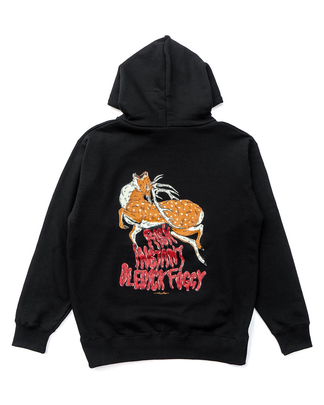 場所は下北沢RISK。OLEDICKFOGGYの伊藤、INSTANTの本間、RISKのHIGO-VISIOUS、そしてアーティストHIROTTONが、缶ビールと王将の餃子を片手に何気なく集まったのがきっかけ。 「インスタント30周年だし、みんなで何かやろうぜ」──そんな一言から生まれた今回のコラボレーション。HIROTTONによる描き下ろしで、RISKの象徴“バンビ”をベースに“ヘラジカ”へとアレンジ。今回のフーディーは、左胸にコラボレーションLOGO、バックに“ヘラジカ”を大きくプリント。 デイリーに使いやすいタフなボディに、HIROTTONのアートワークが映える一着。1/24(土)発売 MOOSE HOODIE — Black / White / Navy @oledickfoggy_official @lifeatyourownrisk @hirotton@bluco.inc_official@instant_skateboards #instantXXX #MARBLE