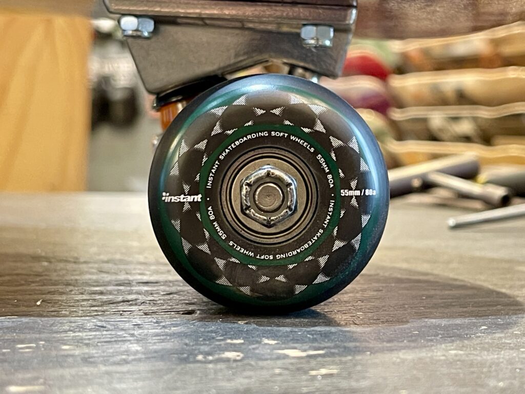 ウィールはインスタントオリジナルのソフトウィールを使用。こちらのウィールは少しマニアックなことを言うとウィールの内側のベアリングの位置がウィールの中心に近い設計になっているので、ワイドトラックを使用する際のいわゆるオーバーフェンダー状態を抑えてくれます。このセッティングの肝です。