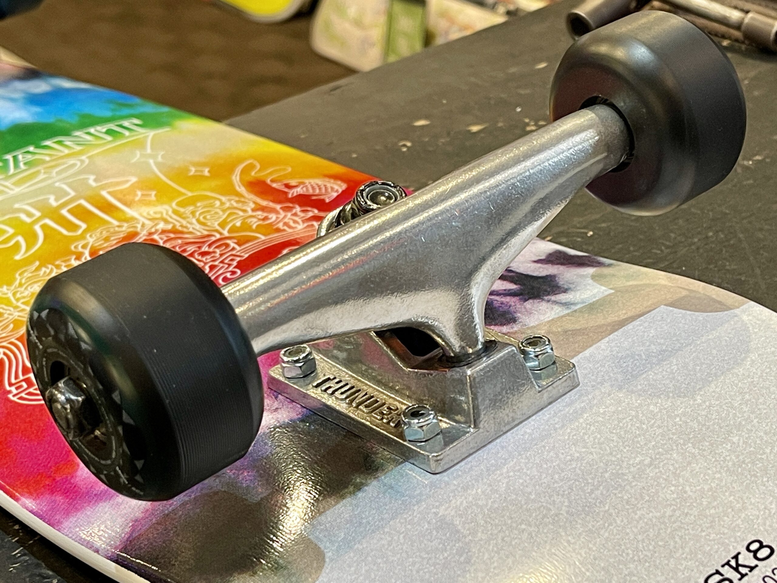 トラックはThunderの148をチョイス。148はそこまで車高が低くないのと、8.0inchデッキに使うとちょこっとオーバーサイズ、これを狙っております。デッキ幅に対してワイドトラックにするとカービングがメロウになります。キュンキュンのセッティングも良いですが、ゆーったり乗るクルーザーもいいですよ。
