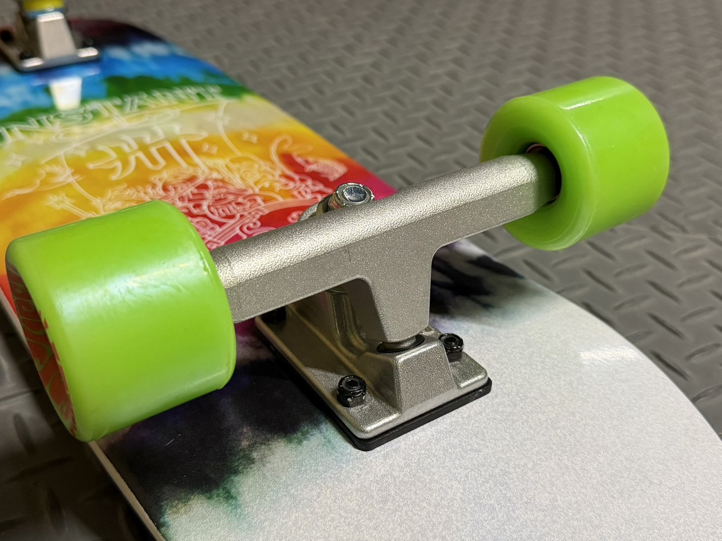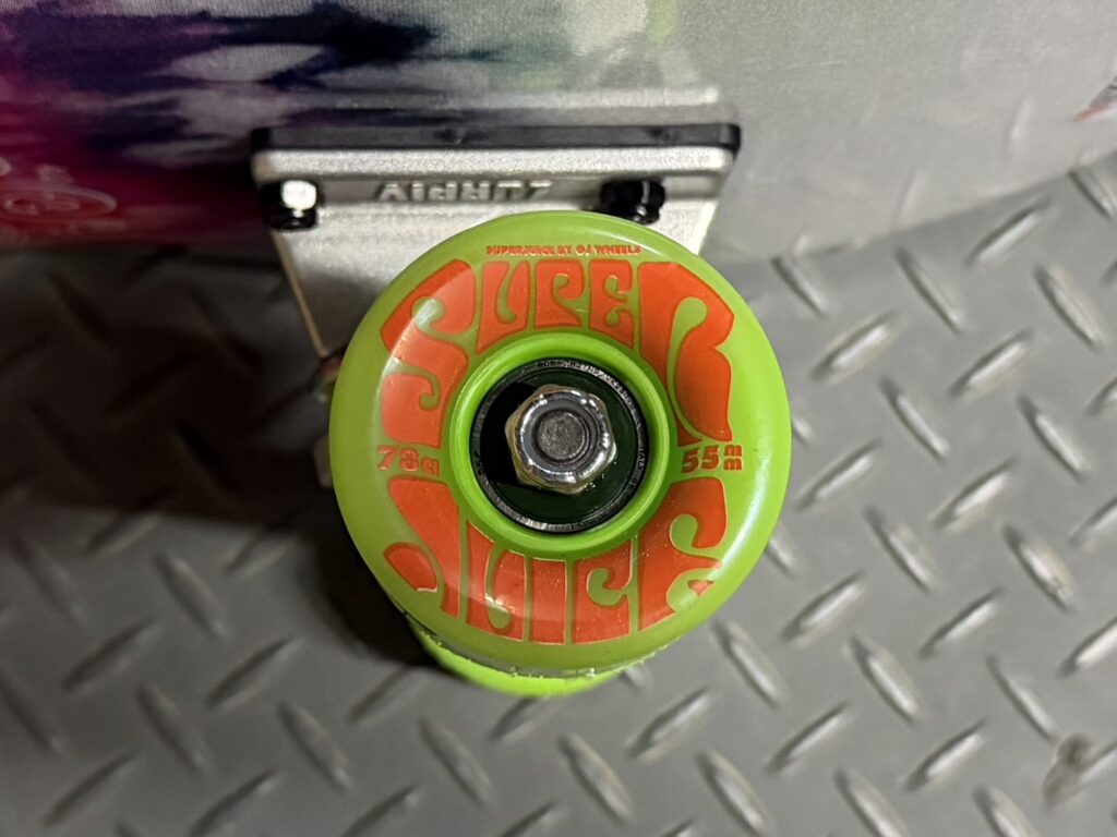 ウィールはもちろんOJ MINI JUICE!今回はトラックが少しデッキからはみ出るようなセットアップなので緑を選んでカエルっぽい可愛いコンプリートに!文句のつけようがないクルーザーウィールです!